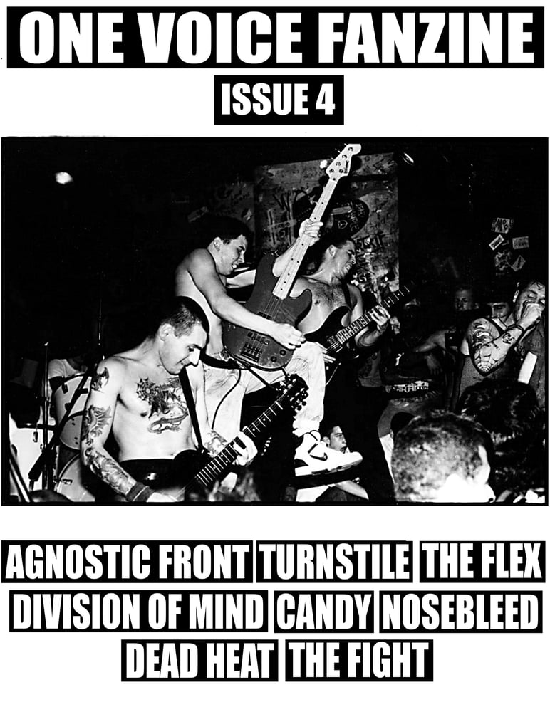 One Voice Fanzine issue 4, featuring interviews with Vinnie Stigma of AGNOSTIC FRONT, Brendan Yates of TURNSTILE, Michael Quick of CANDY & John Scanlon of THE FIGHT. Top 5 lists from Sam Laycock of THE FLEX, Valentina Lopez of NOSEBLEED, Lee & Tye of DIVISION OF MIND, & Anthony Tejada of DEAD HEAT + MORE.